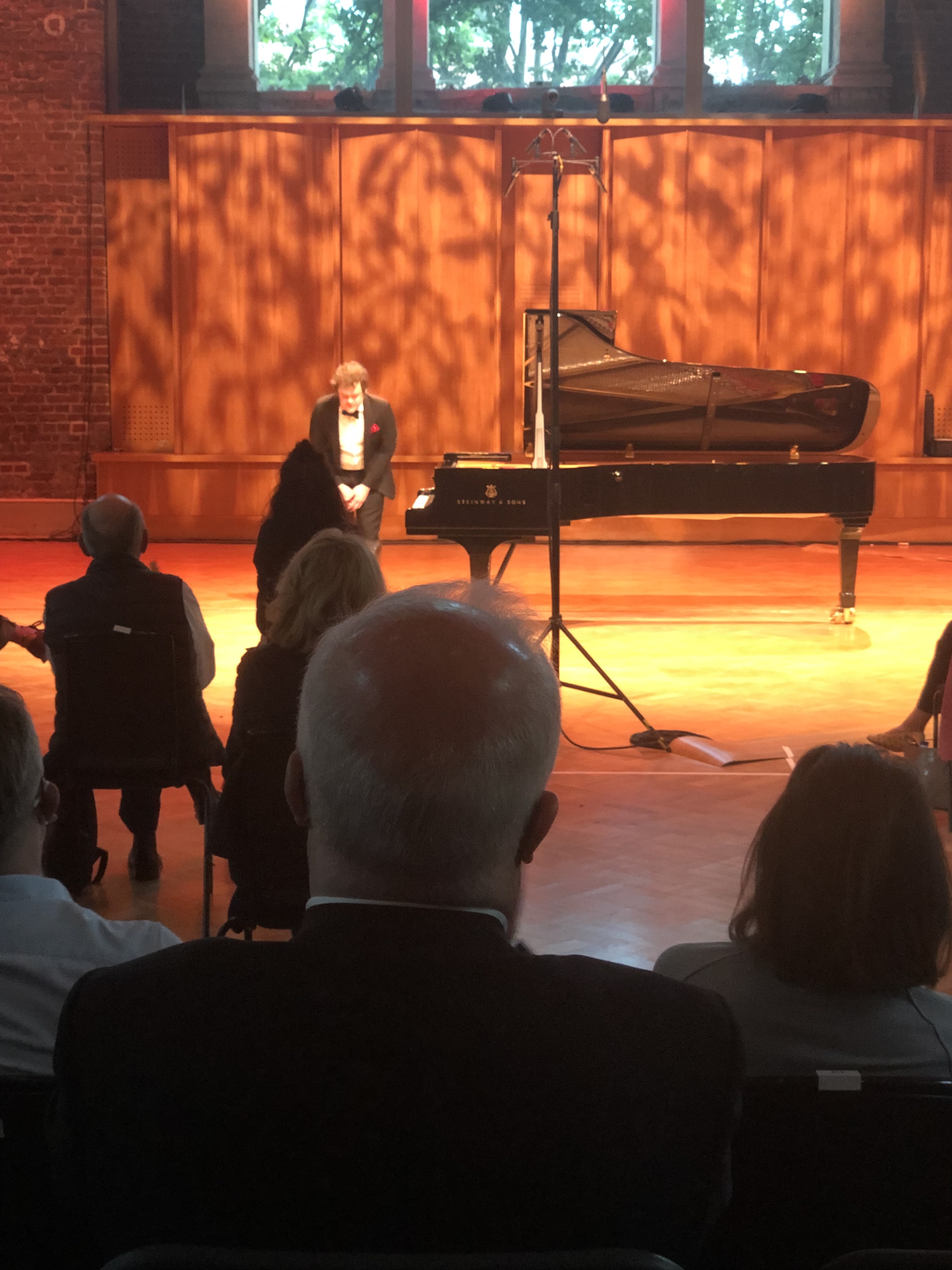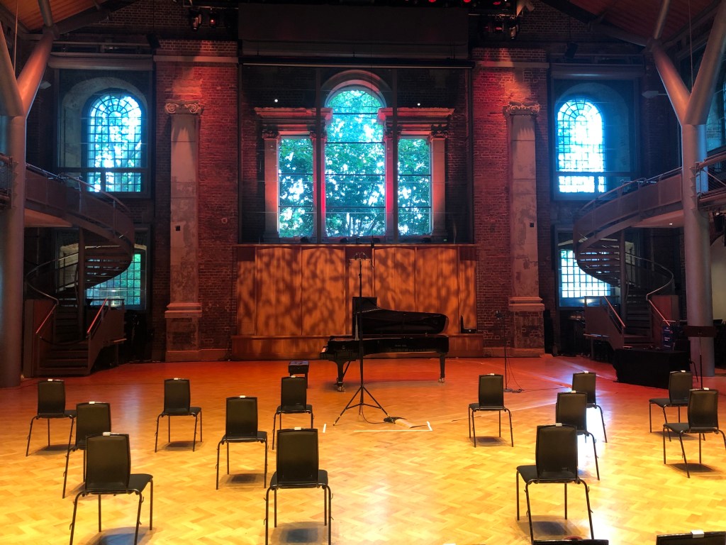 Jerwood Hall was a peaceful shelter away from the steady hum of traffic and post-work gossip of Old Street. Stepping into it, I felt as if I had entered a hall of meditation–befitting of a church-converted concert hall. The arched glass windows, the bricked walls and the stone pillars retained the dignity of a church, but Jerwood Hall was mostly layered over by fresh wood which contributed not only to its modern aesthetic but also its acoustics. The hall was so quiet I could hear my sleeves ruffling as I settled down. The sharpness of its acoustics gave the hall an intensity which took some getting used to, but as people filed in and started chattering, I began to notice the communal atmosphere of the venue. The seats at the back of the hall were put on stands, while the front row was literally a metre away from the pianist, and on the same level. We were at an intimate distance with the preacher at the pulpit; this was going to be a shared experience.