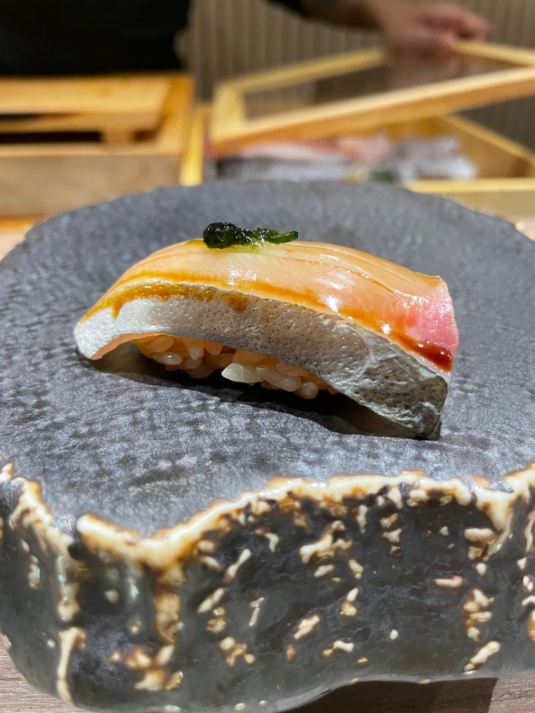 Nevertheless, the joys of the omakase isn’t simply in the food itself. It is in witnessing the whole process of making sushi unfold before you. It is in watching the chef thinly slice the fish into equal portions, mould the sushi rice infused with red wine vinegar into a ball, glue the sashimi and rice together with a dab of wasabi, brush it lightly with soy sauce to create the perfect sushi sitting on a plate in front of us. It is in appreciating the measured perfection of each knife stroke, the art of making these miniature delicacies by hand, knowing that behind the effortlessness lies years of practice.