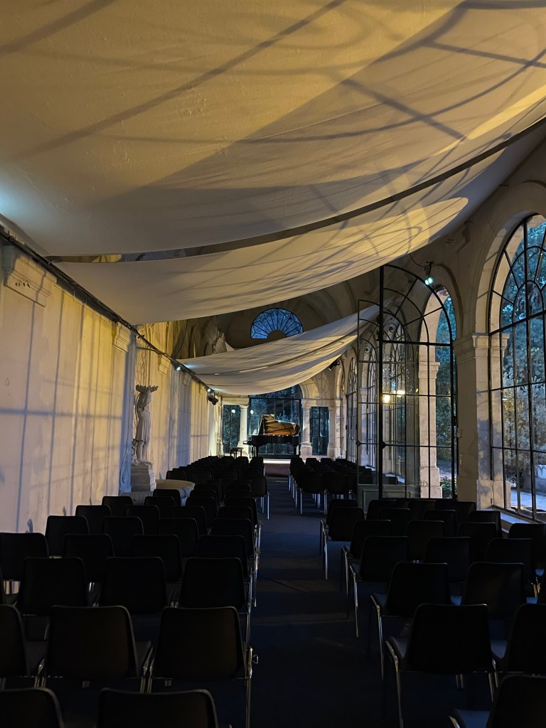 We got to the l’orangerie, which was now packed with people and transformed into a beautiful recital hall. There was a spotlight on the piano. Everyone was here for the inaugural concert of the Festival. Fabrice stepped up to make his introduction and then Bridget and I stepped onstage to stutter in French and then it was go time.